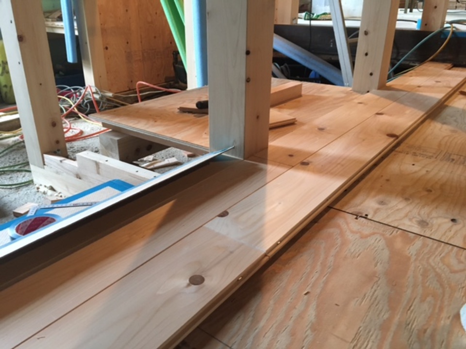 大工の白井です。2階の床下地を行いました。断熱材を敷き込み、針葉樹合板をはっています。