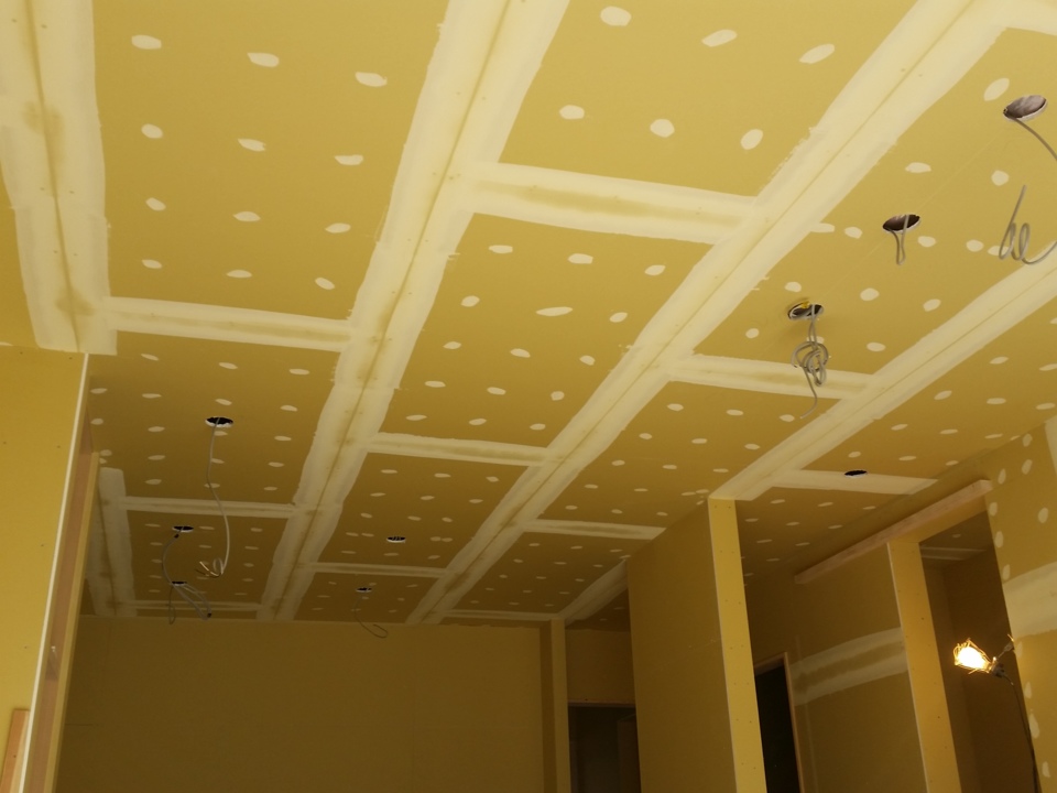 中川です。仕上げ材の取付を行っています。細かな事かもしれませんが、無目が入る枠材も加工して取付を行っています。