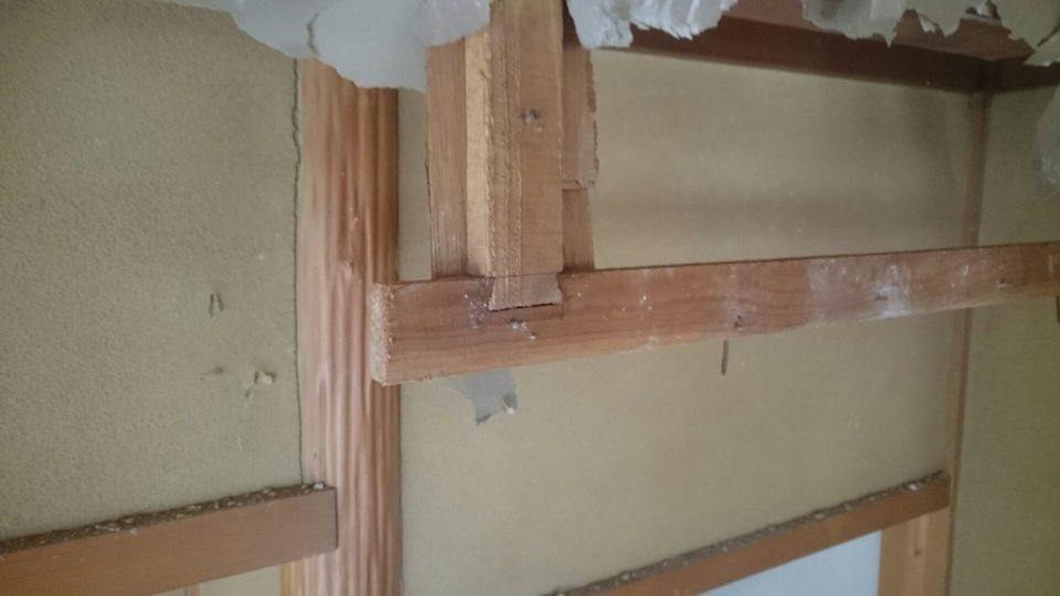 大工の荒木です。リフォームがされていた部屋は、胴縁が細かく入れられていて、PBをめくるのも一苦労です。