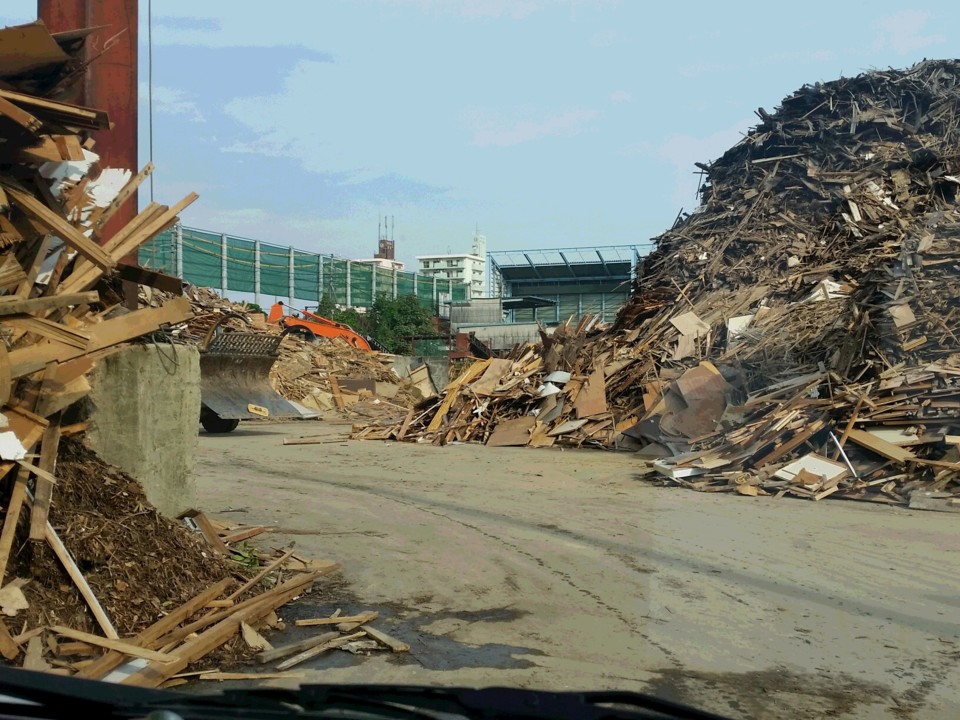 大工の中川です。名古屋市南の大江にある名古屋港木材倉庫という廃木材の処分場に来ています。木くずを破砕して、リサイクル燃料やリサイクル材料に生まれ変わります。